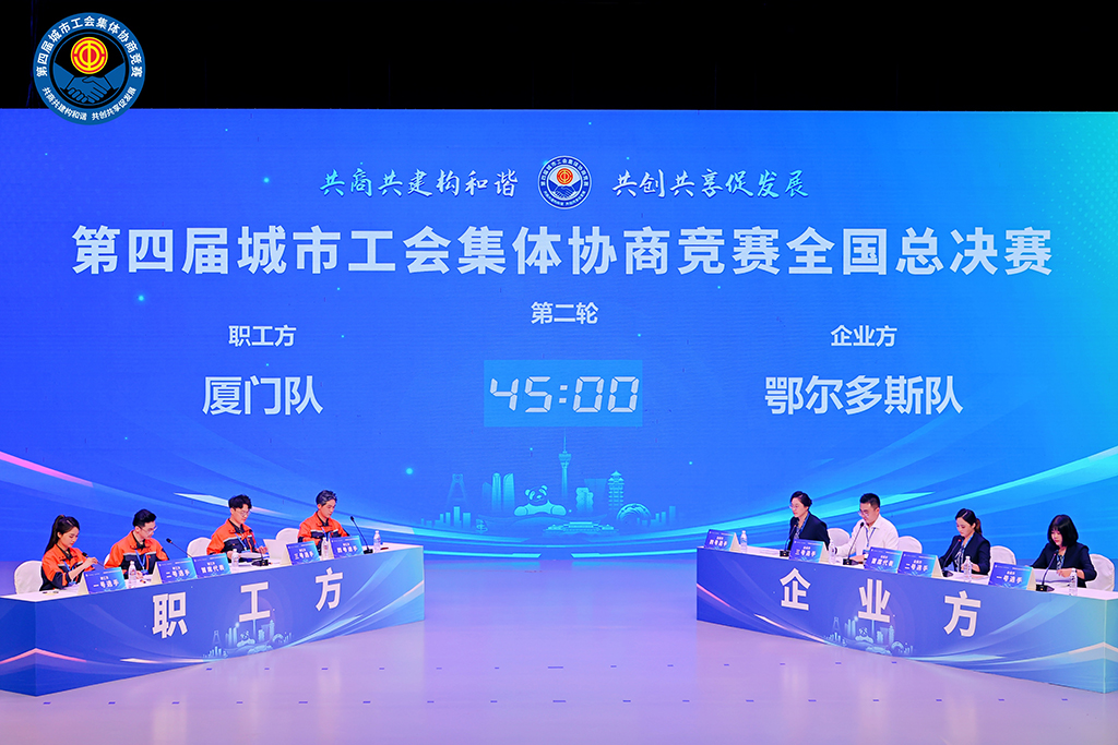 赛前,在福建省总工会与厦门市总工会的指导和支持下,参赛队伍进行了为期四周的赛前集训。决赛现场,由厦门队代表职工方向企业方(鄂尔多斯队)发出工资集体协商邀约,提出工资增长、优化技能津贴标准等诉求,并就《技能人才创新奖励办法》展开协商。选手们思路清晰、齐心协力、沉着应战,从分歧到对话,从博弈到共赢,其中,陈子烨、陈鑫以其个人突出表现,荣获大赛“优秀选手”称号。