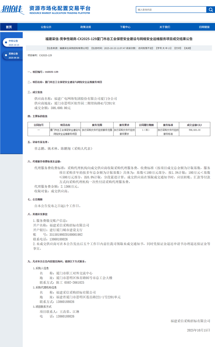 厦门市总工会保密安全建设与网络安全运维服务项目成交结果公示