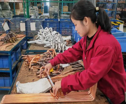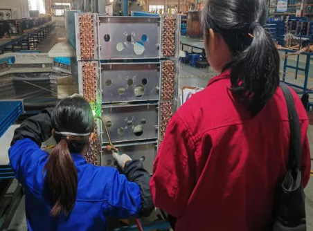 过程检验容不得半点马虎。从铜管折弯0.1毫米的精度把控,到翅片翻边的高度校准,再到芯体总成的安装尺寸核对、管道焊点的牢固度检测,兰水英逐一细查。她手持卡尺紧贴铜管,眼睛盯着刻度,指尖轻轻调整测量角度,确保每一组数据精准无误。“开年第一批产品,关乎全年口碑。”她一边说着,手上的动作一刻不停。
