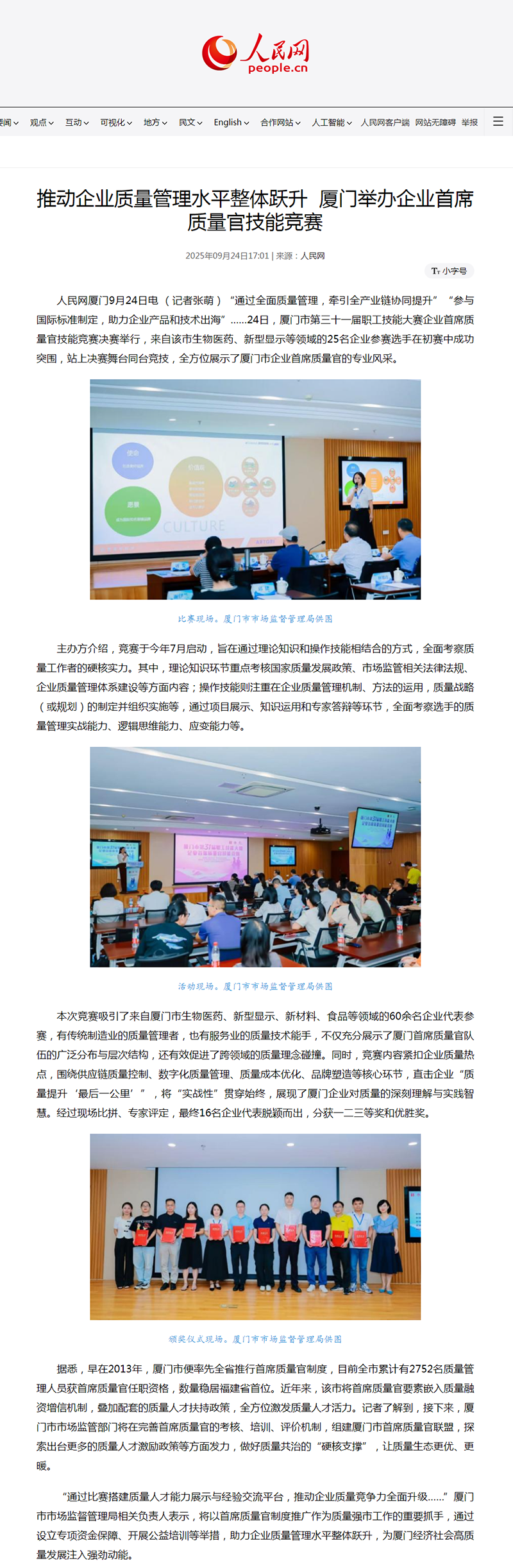 “通过比赛搭建质量人才能力展示与经验交流平台,推动企业质量竞争力全面升级……”厦门市市场监督管理局相关负责人表示,将以首席质量官制度推广作为质量强市工作的重要抓手,通过设立专项资金保障、开展公益培训等举措,助力企业质量管理水平整体跃升,为厦门经济社会高质量发展注入强劲动能。