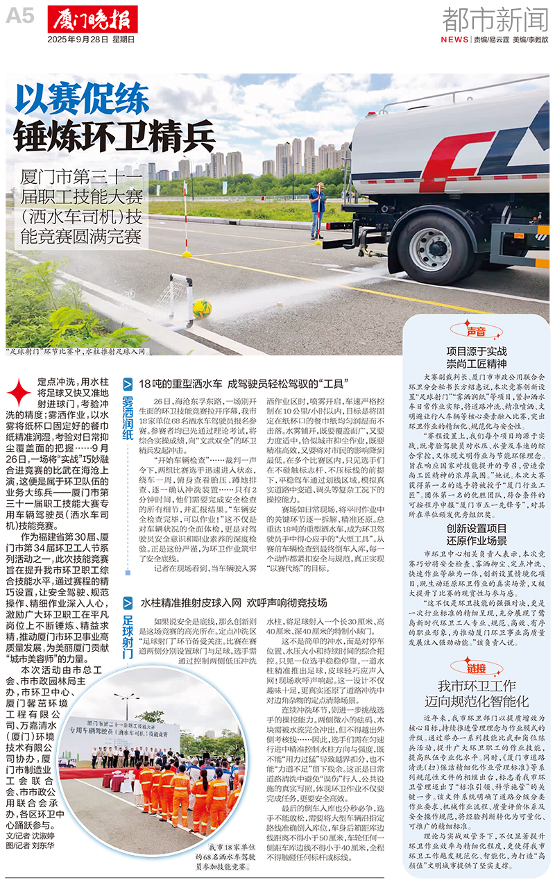 大赛副裁判长、厦门市市政公用联合会环卫分会秘书长方绍惠说,本次竞赛创新设置“足球射门”“雾洒润纸”等项目,紧扣洒水车日常作业实际,将道路冲洗、精准喷洒、文明避让行人车辆等核心要素融入比赛,突出环卫作业的精细化、规范化与安全性。