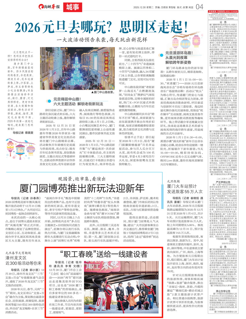 导报讯 (记者 钱玲玲 通讯员 李菁 文/图) 12月28日,厦门市总工会“工会红 暖心间”送温暖行动——2026“两节”慰问演出走进集美软件园TOD项目,这也是“2026厦门职工春晚”的首场演出,来自多家单位的300多名一线建设者参加活动。
