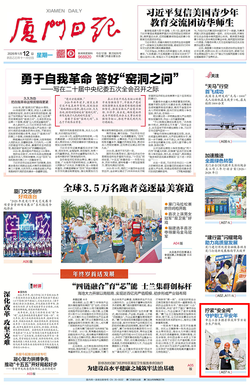 连日来,厦门市总工会立足工会职能、紧扣中心工作,接连印发《关于做好2026年元旦春节期间安全生产工作的通知》与《安全生产工作提示函》,拧紧岁末年初安全生产“责任阀”。从工会系统内部动员到面向全市用人单位精准提醒,层层压实责任、强化监督提醒,推动安全生产各项措施落细落实,切实为全市经济社会平稳运行和职工群众安居乐业夯实安全底座。