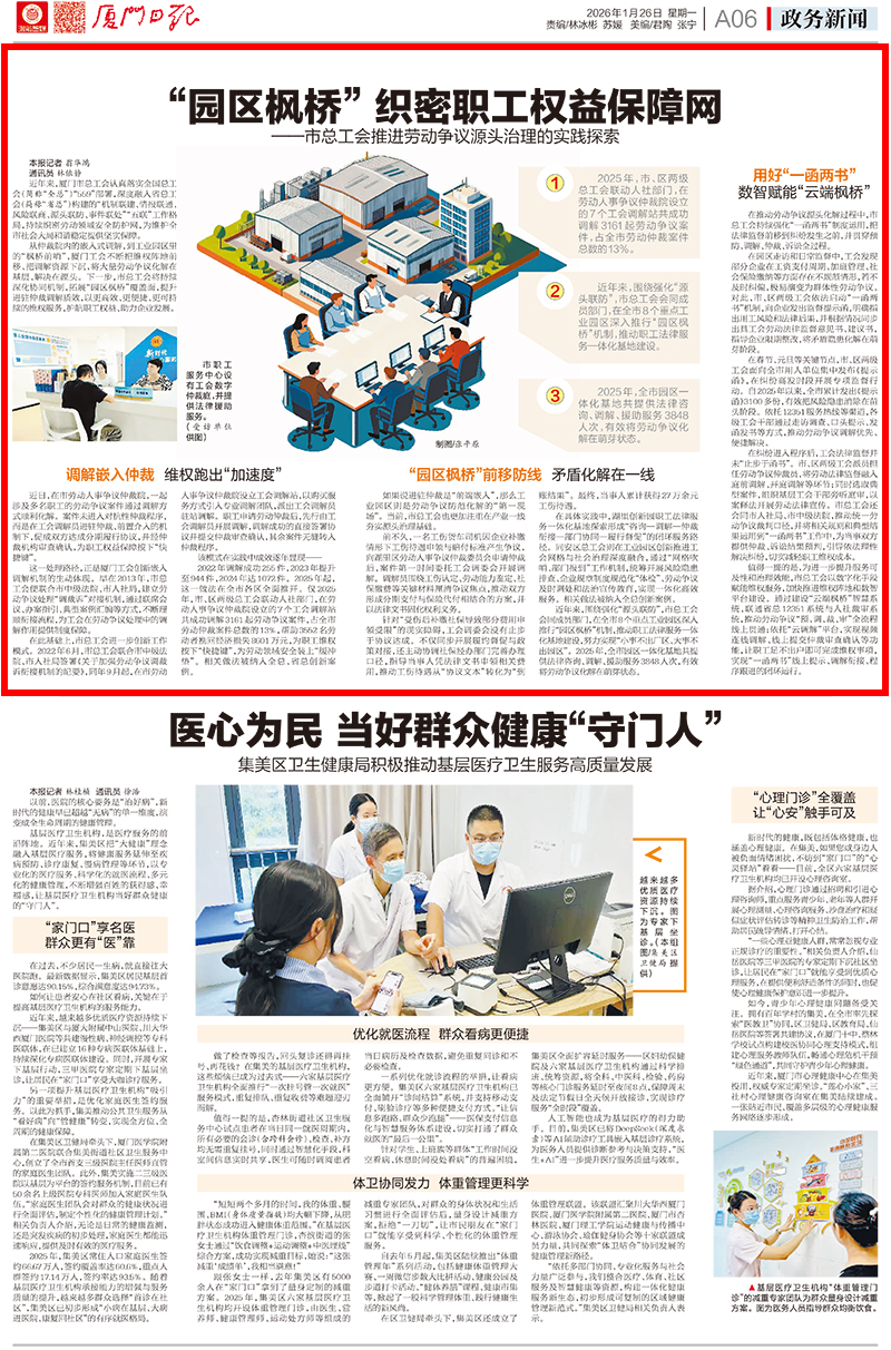 从仲裁院内的嵌入式调解,到工业园区里的“枫桥前哨”,厦门工会不断把维权阵地前移、把调解资源下沉,将大量劳动争议化解在基层、解决在源头。下一步,市总工会将持续深化协同机制,拓展“园区枫桥”覆盖面,提升进驻仲裁调解质效,以更高效、更便捷、更可持续的维权服务,护航职工权益、助力企业发展。