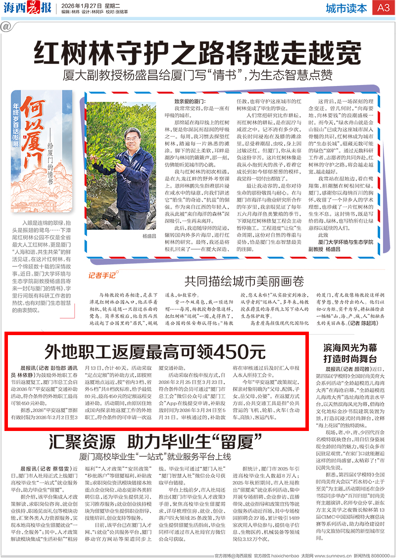晨报讯(记者 彭怡郡 通讯员 林依静)为鼓励外地职工春节后返厦复工,厦门市总工会启动2026年“平安返厦”交通补助活动,符合条件的外地职工最高可领450元补助。
