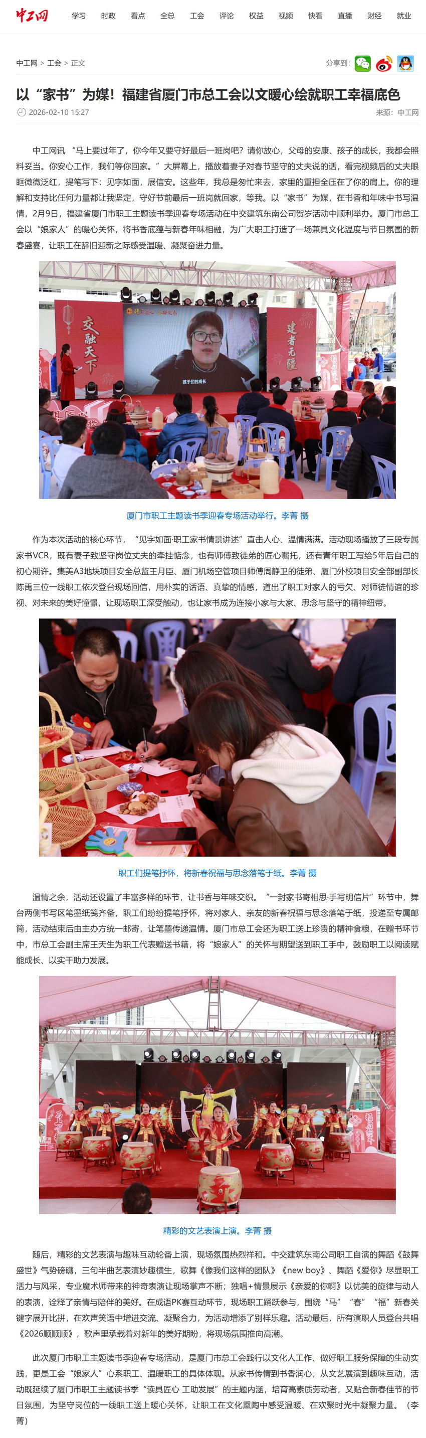 此次厦门市职工主题读书季迎春专场活动,是厦门市总工会践行以文化人工作、做好职工服务保障的生动实践,更是工会“娘家人”心系职工、温暖职工的具体体现。从家书传情到书香润心,从文艺展演到趣味互动,活动既延续了厦门市职工主题读书季“读具匠心 工助发展”的主题内涵,培育高素质劳动者,又贴合新春佳节的节日氛围,为坚守岗位的一线职工送上暖心关怀,让职工在文化熏陶中感受温暖、在欢聚时光中凝聚力量。(李菁)