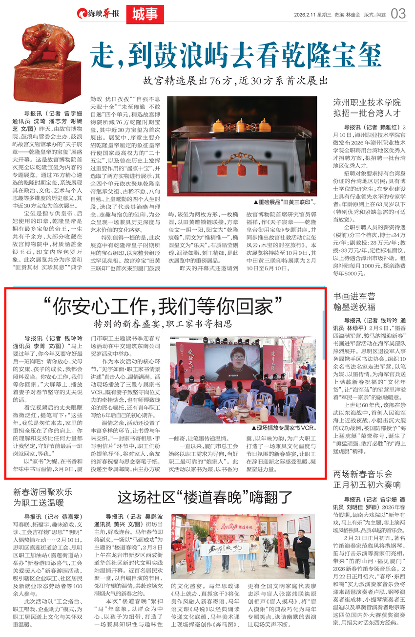 一直以来,厦门市总工会始终以职工需求为导向,当好职工最可靠的“娘家人”。此次活动以家书为媒、以书香为翼、以年味为韵,为广大职工打造了一场兼具文化温度与节日氛围的新春盛宴,让职工在辞旧迎新之际感受温暖、凝聚奋进力量。