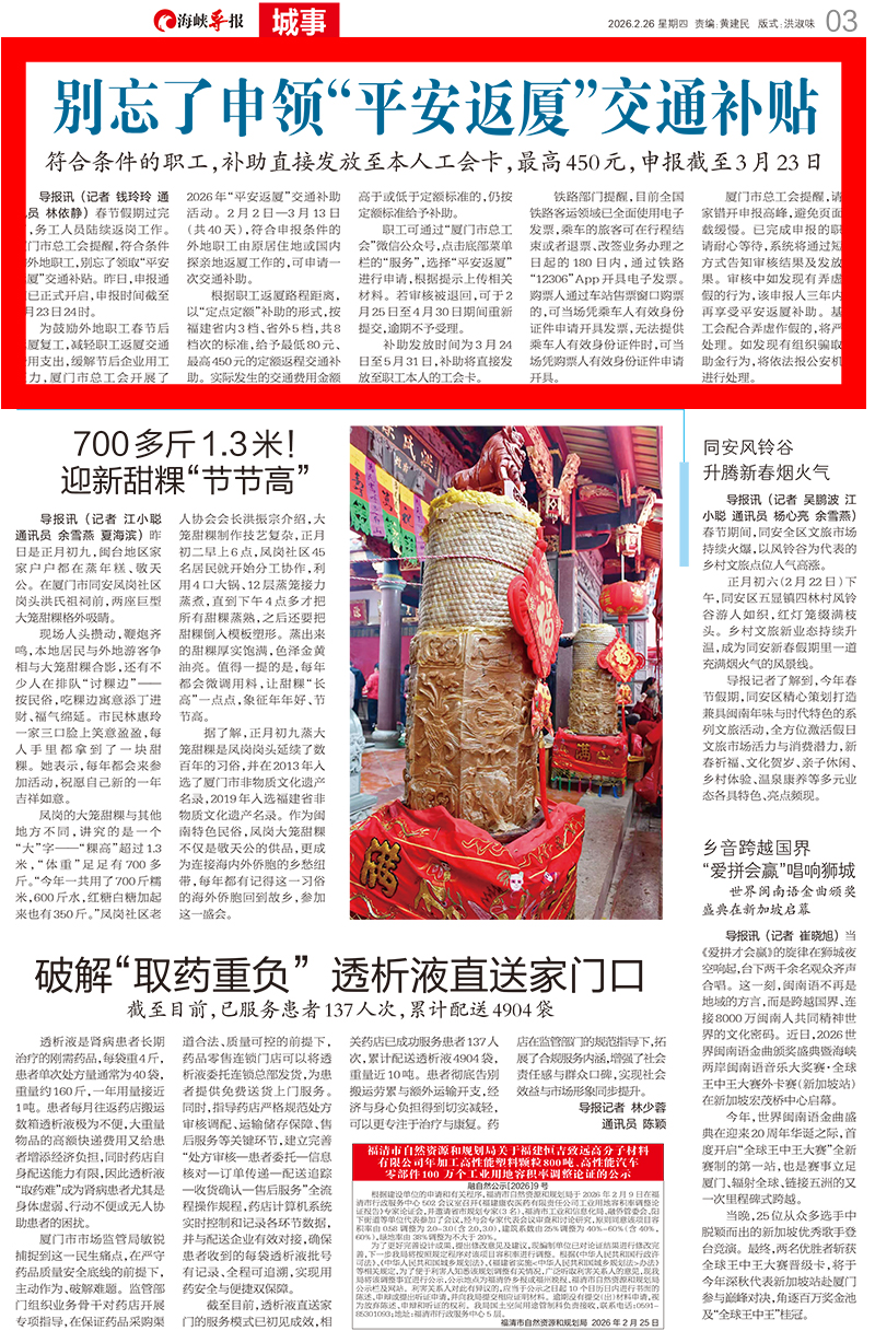 为鼓励外地职工春节后返厦复工,减轻职工返厦交通费用支出,缓解节后企业用工压力,厦门市总工会开展了2026年“平安返厦”交通补助活动。2月2日—3月13日(共40天),符合申报条件的外地职工由原居住地或国内探亲地返厦工作的,可申请一次交通补助。
