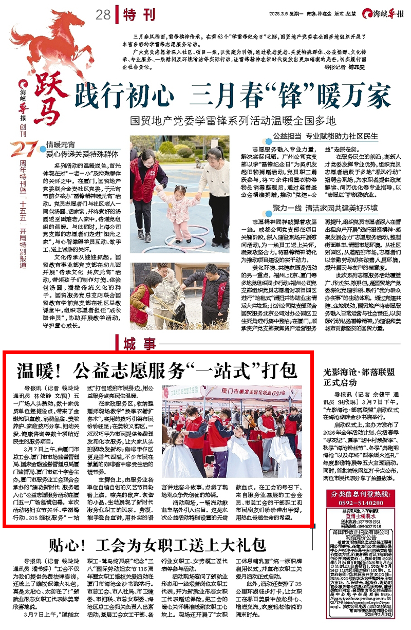 3月7日上午,由厦门市总工会、厦门市市场监督管理局、国家金融监督管理总局厦门监管局、厦门市红十字会主办,厦门市服务业工会联合会承办的“建功新时代 服务暖人心”公益志愿服务活动在厦门五一广场温情启幕。本次活动将妇女节关怀、学雷锋行动、315维权服务“一站式”打包送到市民身边,用公益服务点亮民生温暖。