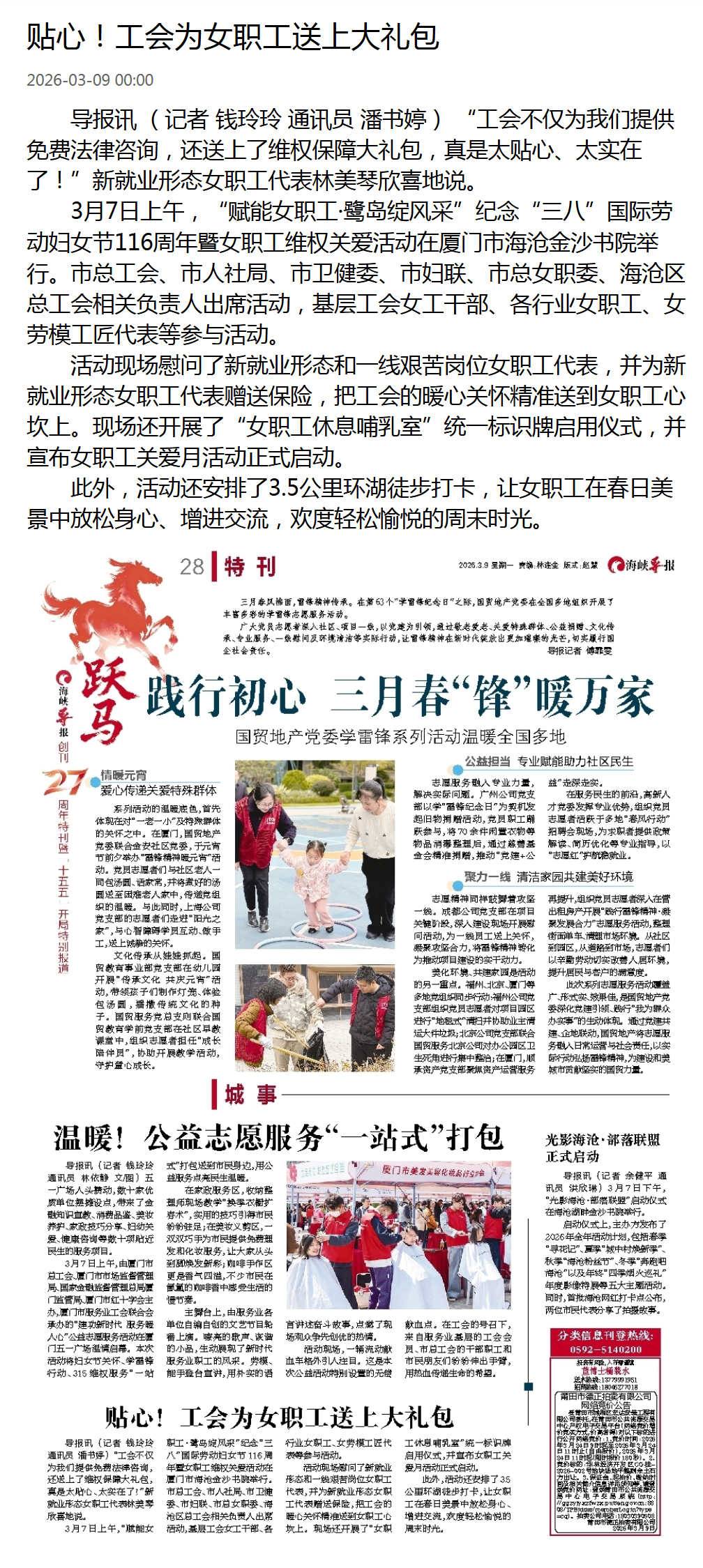 导报讯 (记者 钱玲玲 通讯员 潘书婷) “工会不仅为我们提供免费法律咨询,还送上了维权保障大礼包,真是太贴心、太实在了!”新就业形态女职工代表林美琴欣喜地说。