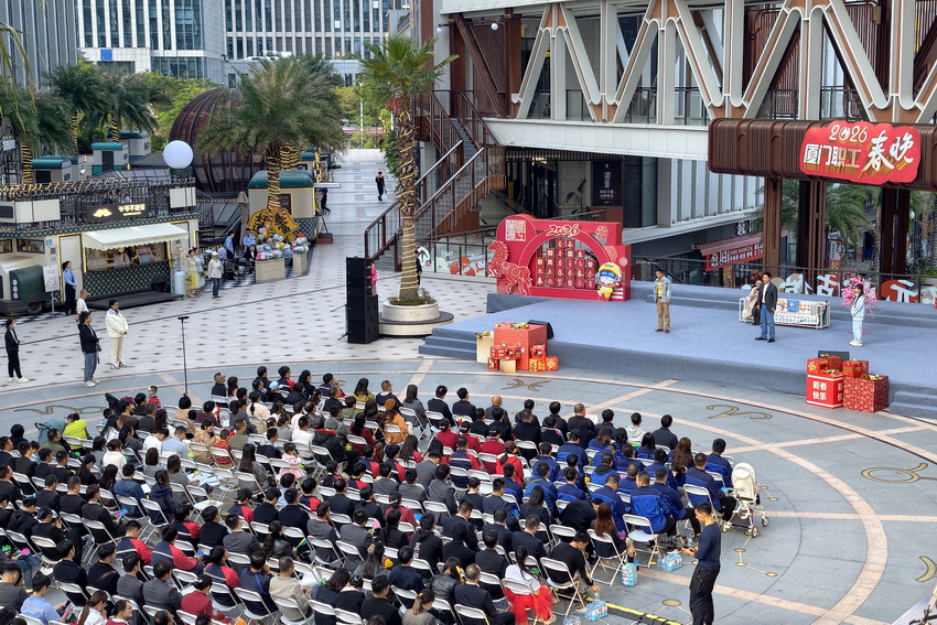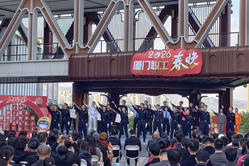 12月28日,厦门市总工会“工会红 暖心间”送温暖行动——2026“两节”慰问演出走进集美软件园TOD项目,这也是“2026厦门职工春晚”的首场演出。来自厦门市总工会、市宣教部、市服务业工联会、市信息工会、福建高速、市卫健委等相关负责人及多家单位的一线建设者300多人参加活动。活动由厦门市总工会、厦门广播电视集团主办,厦门市服务业工会联合会承办,厦门轨道集团协办,厦门广播电视集团节目中心策划执行。