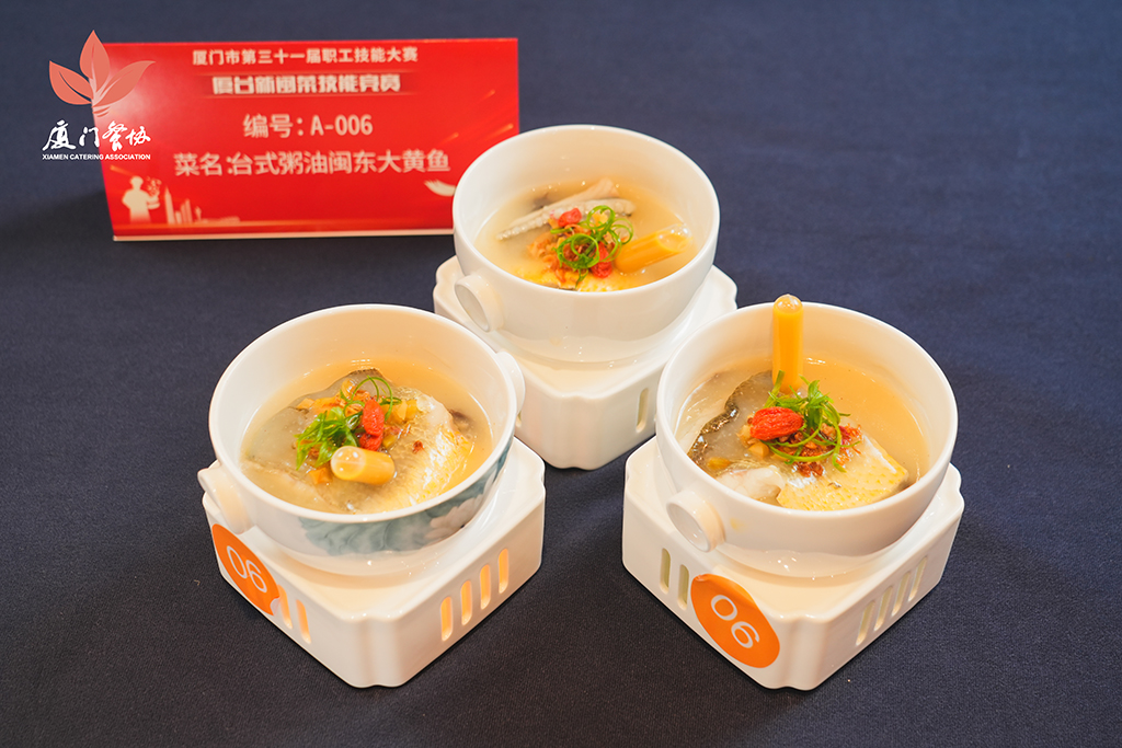 吴宗鸿是厦门羊公馆餐厅的老板,来自台湾高雄,已在厦生活了23年。此次他带来了卤肉饭与三杯鸡两道经典台菜。他说:“这次带来的创新是:在三杯鸡中加入闽南特色米血糕。台湾菜的源头本就是闽南菜,这样的融合自然又亲切,像是味道的‘寻根’。”对他而言,参赛重在交流,能通过美食与更多同行对话,本身就是收获。来自台中的陈耀民在两岸多家餐厅担任过法餐主厨与餐饮顾问。他展示了一道源自母亲手艺的“葱烧大排”,还有一道用西式油封技法处理的海鲈鱼,佐以他自己调制的、融合了番茄与柠檬风味的沙茶酱。陈耀民说:“我希望保留沙茶酱的底蕴,而用番茄和柠檬来提升酸度,可以让味道更富有层次感。闽菜的创新不是‘脱根’,而是用新的技艺让传统风味焕发新生,带来意想不到的味蕾碰撞。”谈及参赛初衷,他笑称源于“好玩”。“比赛是创意的交流,能看到同行们的创意菜品实属有趣。下次有机会一定会再来参加!”来自高雄的黄威瀚如今在广州、深圳、台湾的几家酒店担任大厨,他带来的作品致力于探索台菜与粤菜的融合可能。他制作的一道海鲜粥,借鉴了粤式手法做粥,再加入炸香的台湾红葱酥。他说:“我想做的,是让台湾味与各地菜系融合,打造更精致、更有层次的口感体验。”