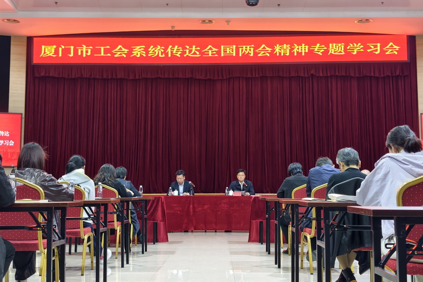 3月20日上午市总工会召开党组扩大会议暨党组理论学习中心组扩大会议集中学习传达2026年全国两会精神。全国人大代表、全国劳动模范,厦门集装箱码头集团有限公司工会主席冯鸿昌传达全国两会精神。厦门市总工会党组书记、副主席邱武伟主持会议并讲话。