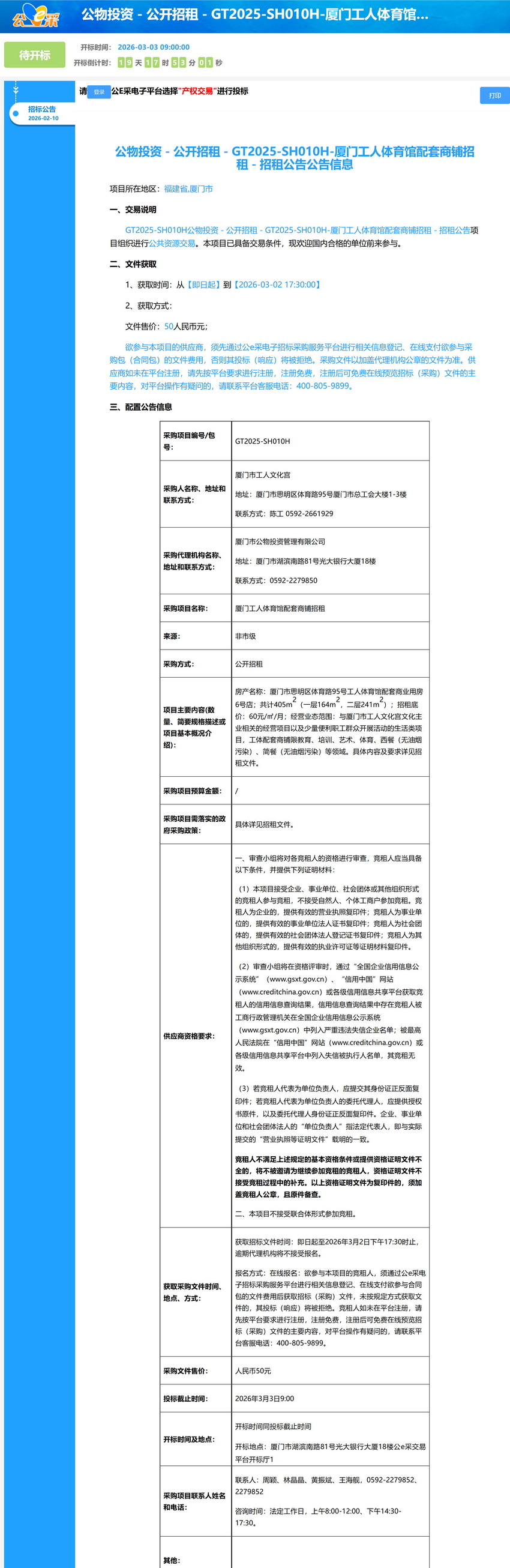 公物投资-公开招租-GT2025-SH010H-厦门工人体育馆配套商铺招租-招租公告公告信息