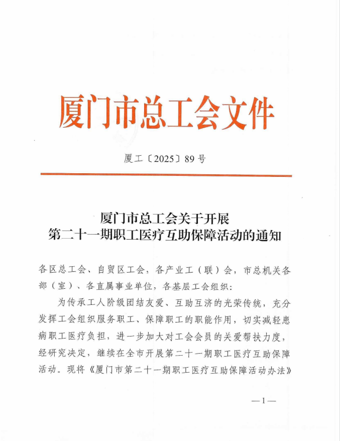 厦工〔2025〕89号(权益保障部)厦门市总工会关于开展第二十一期职工医疗互助保障活动的通知.pdf