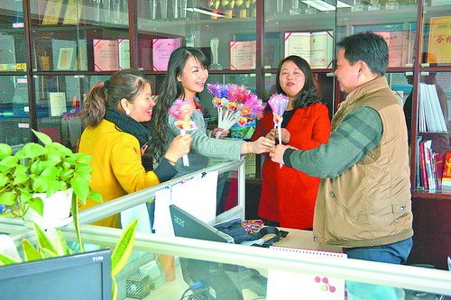 情人节,陈丽丽(左二)会买来巧克力扎成花束送给员工。