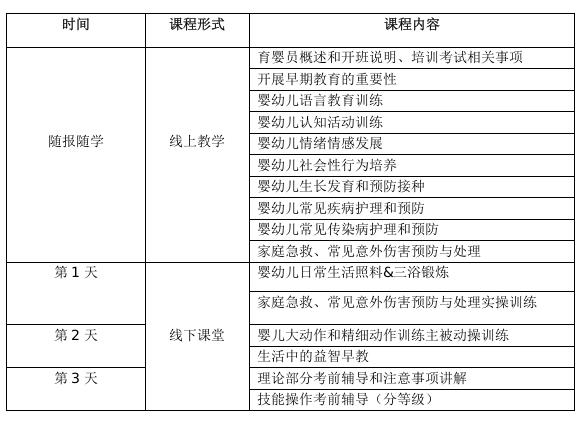 主要从事0-3岁婴儿照料、护理和教育工作,从婴幼儿日常生活照料&三浴锻炼、家庭急救、常见意外伤害预防与处理、婴儿大动作和精细动作训练等内容入手,是系统全面的实用型育儿课程。